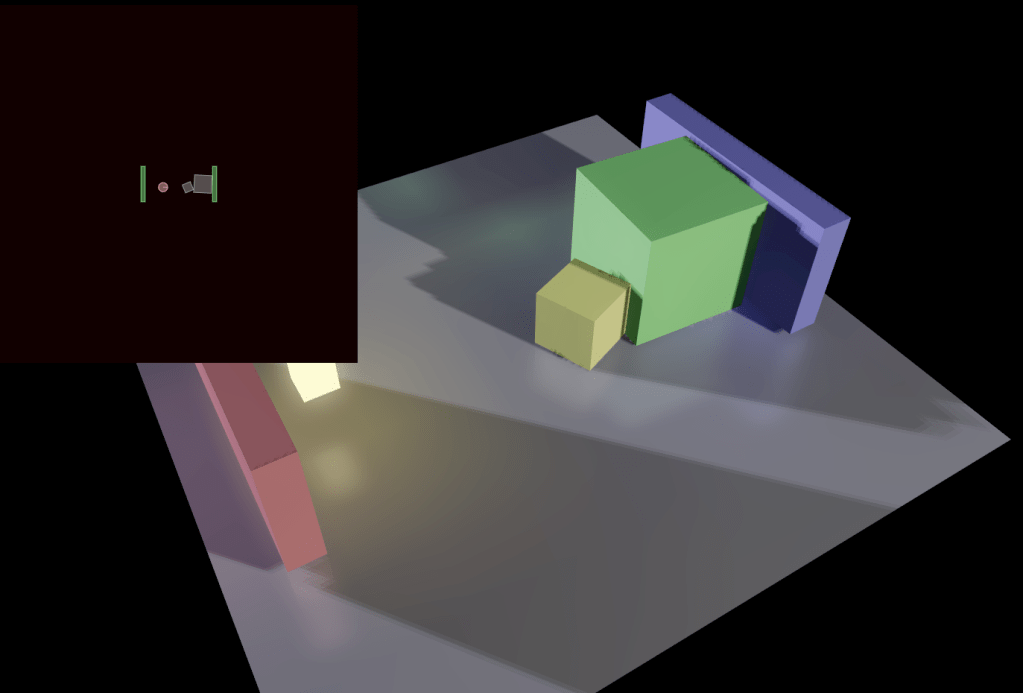 - top-down physics with wall collisions, movable obstacles, sensors, pleasant “weighty” feel